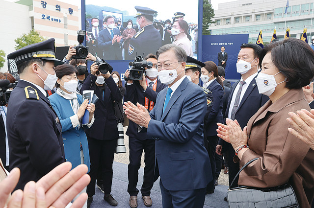 문재인 대통령이 21일 충남 아산시 경찰인재개발원에서 열린 제75주년 경찰의 날 기념식을 마친 뒤 공상 경찰관인 김진영 순경을 격려하고 있다.
