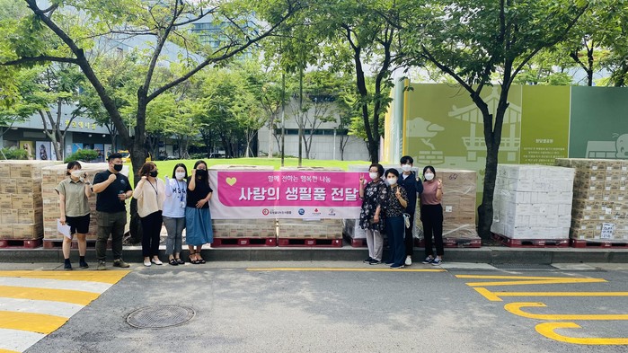 서울 도봉구가 (사)희망을나누는사람들로부터 최근 1억원 상당의 생필품을 전달받았다. (사)희망을나누는사람들은 애경산업에서 후원받은 치약·칫솔 등 물품 약 2000상자를 구에 전달했으며, 구는 이 물품들을 동주민센터 및 지역내 사회복지시설을 통해 저소득층에 전달할 예정이다. 사진은 전달식에서 관계자들이 기념촬영을 하는 모습. (사진제공=도봉구청)
