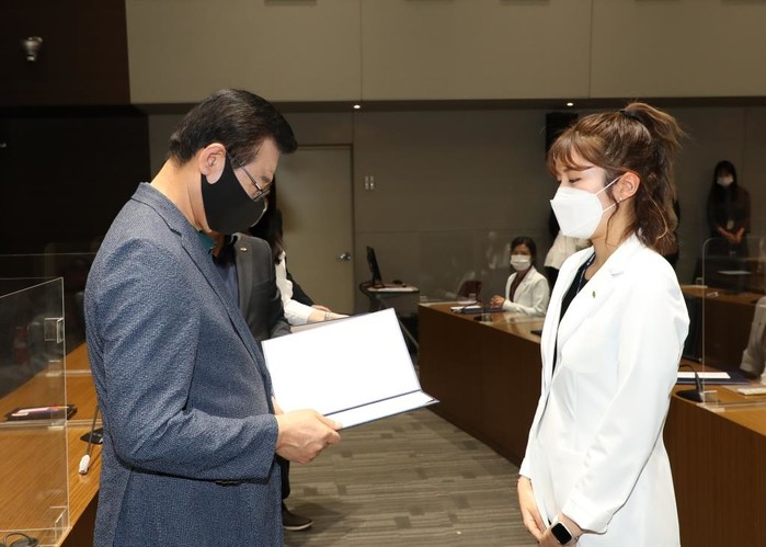 서울 용산구는 최근 코로나19 대응 유공 공무원으로 강태환(행정지원과), 유비(자치행정과), 강달현(기획예산과), 공희영(일자리경제과)씨 등 22명을 표창했다. 사진은 이날 성장현 구청장(왼쪽)이 유공 공무원에게 표창을 수여하고 있는 모습. (사진제공=용산구청)