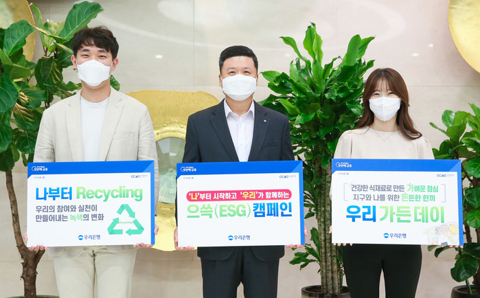 [시민일보 = 홍덕표 기자] 우리금융지주 자회사 우리은행은 ESG경영 강화를 위해 전사적으로 추진 중인 ‘으쓱(ESG) 캠페인’의 일환으로 본점 전부서에 분리수거함을 도입하는 ‘나부터 Recycling’ 캠페인과 매주 금요일 직원식당에 저탄소 식단을 제공하는 ‘우리 가든 데이’를 실시한다고 1일 밝혔다.