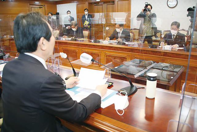 정세균 국무총리(왼쪽)가 10일 정부서울청사에서 한국토지주택공사(LH) 직원들의 3기 새도시 투기 의혹 수사를 위한 긴급 관계기관 회의를 소집해 발언하고 있다. 이날 회의에는 박범계 법무부 장관과 전해철 행안부 장관, 김창룡 경찰청장, 검찰총장 직무대행인 조남관 대검찰청 차장검사가 참석했다.