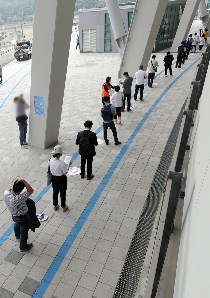 17일 오전 경기도 용인시민체육공원에서 열린 용인시 일자리 박람회를 찾은 방문객들이 안내에 따라 일정 거리를 두고 길게 줄을 늘어서 있다.