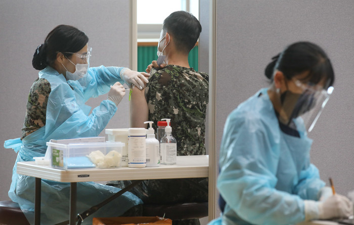 24일 경기도 고양시 육군 9사단 본부에서 군 장병이 코로나19 백신을 접종하고 있다.