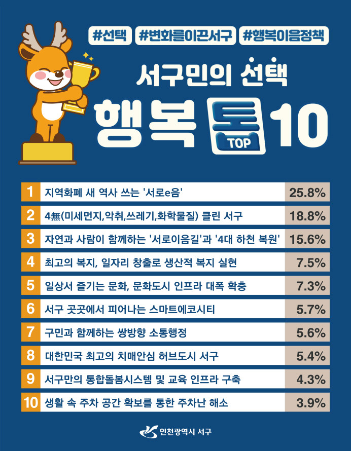 그 결과, 55만 구민 중 40만 이상이 사용하는 지역화폐 ‘서로e음’이 25.8%의 지지를 받아 1위에 선정됐다. 2위로는 ‘클린서구 환경정책’이 뒤를 이었으며, 3위는 친환경 둘레길 ‘서로이음길’과 4대 하천복원이 선정됐다.