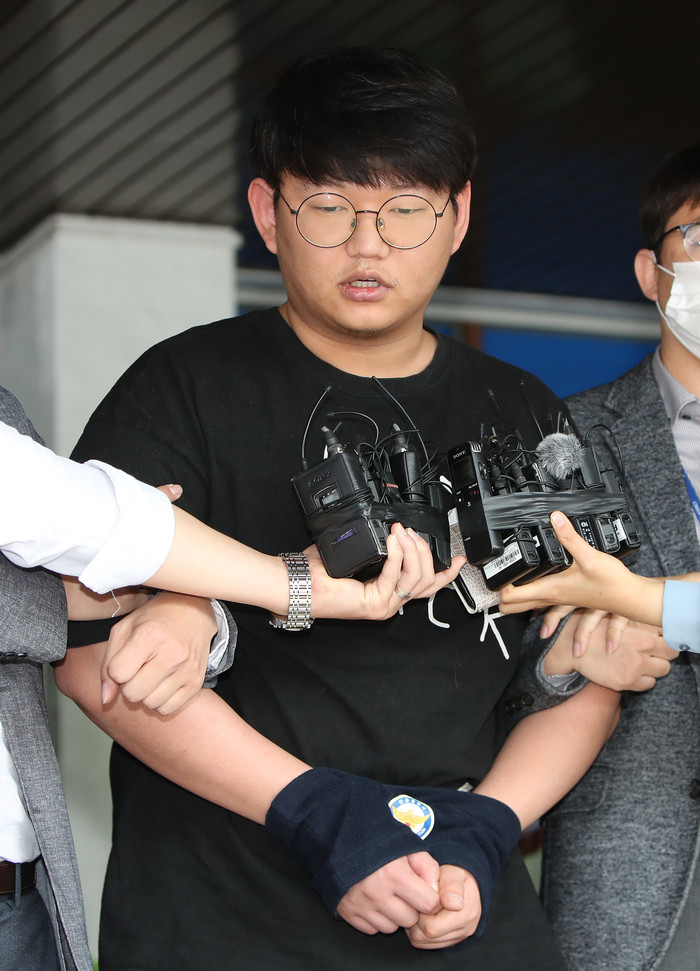 성 착취물을 공유하는 텔레그램 대화방인 'n번방' 운영자로 경찰에 구속된 '갓갓' 문형욱(24·대학생)이 18일 오후 검찰로 송치되기 전 경북 안동시 안동경찰서를 나서며 기자들의 질문에 답하고 있다. 경북지방경찰청은 아동 청소년성보호법 위반 등 혐의로 구속한 문형욱을 이날 대구지검 안동지청에 송치한다고 밝혔다.