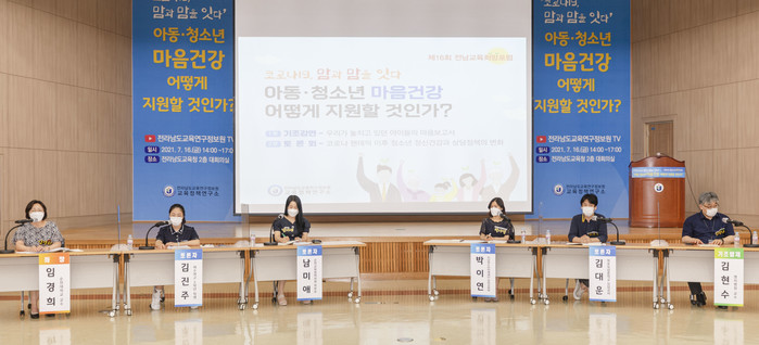 전남도교육청 산하 전남교육정책연구소가 주최한 제16회 전남교육 희망포럼이 '코로나19, 맘과맘을 잇다 아동청소년 마음건강 어떻게 지원할 것인가?'를 주제로 16일 오후 전남도교육청 2층 대회의실에서 열렸다. 이날 포럼에서는 코로나19로 심각해지고 있는 아동·청소년들의 정신건강 위기 극복방안을 놓고 깊이 있는 토론이 펼쳐졌다. 사진은 학생, 학부모, 상담교사, 전문가 등 4명의 패널들이 토론을 하는 모습. (사진제공=전남도교육청)