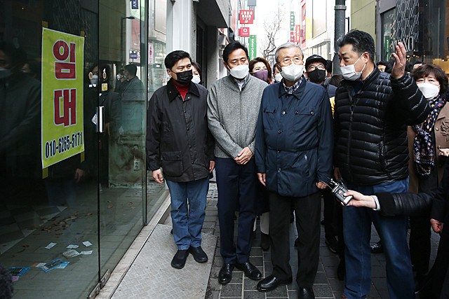 국민의힘 김종인 비상대책위원장(가운데), 오세훈 서울시장 후보(가운데 왼쪽) 등이 10일 서울 중구 명동 상가 일대를 찾아 상인회 관계자들과 함께 둘러보고 있다.