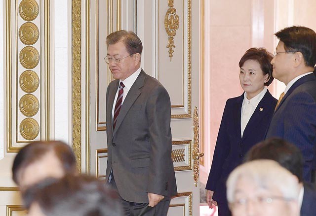 문재인 대통령이 2일 오후 김현미 국토교통부 장관으로부터 부동산 대책과 관련한 긴급 보고를 받은 뒤 이번 대책과 관련한 지시를 내렸다. 사진은 문 대통령이 지난 2월 청와대에서 국토교통부 업무보고를 받기 위해 김현미 장관과 함께 들어서는 모습.