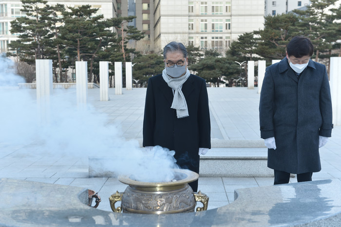 이재정 경기도교육감이 4일 경기 수원시 현충탑 참배로 2021년 새해 공식 일정을 시작했다. 사진은 이 교육감(왼쪽)이 현충탑 참배를 하고 있는 모습. (사진제공=경기도교육청)