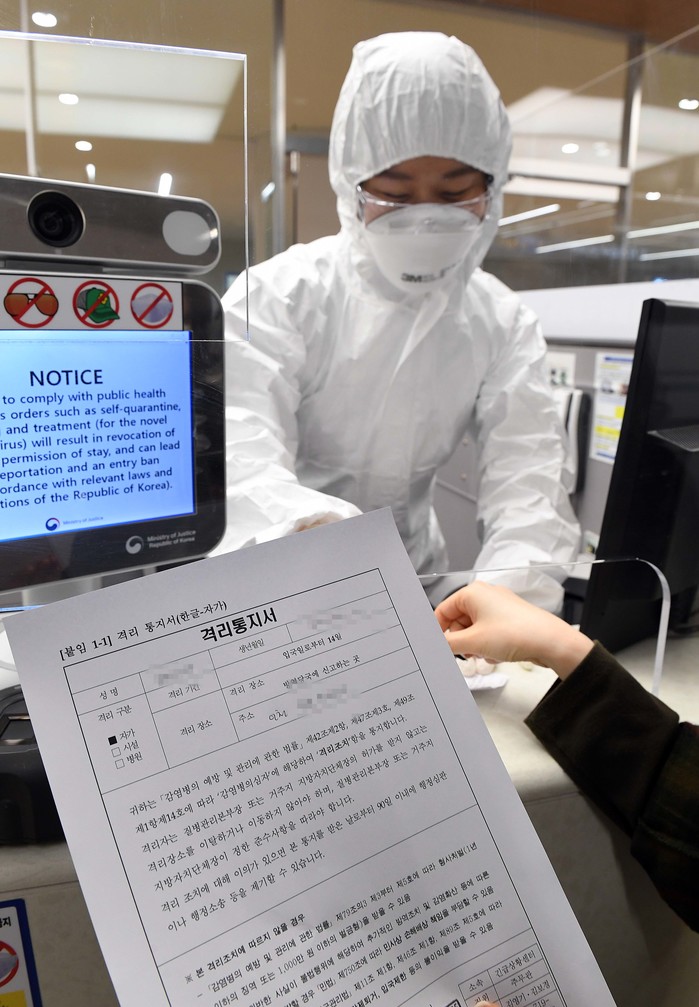 전신 방호복을 입은 인천국제공항 출입국 외국인청 입국심사관이 8일 오후 유증상자 전용 입국심사대에서 입국심사 후 자가격리 지침을 설명하고 있다.