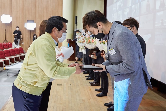 충남 아산시가 30일 청소년교육문화센터 스마트홀에서 이창호 아산시장애인연합회장, 오세현 시장을 비롯한 관계자가 참석한 가운데 '제41회 장애인의 날' 기념식을 개최했다. 이날 장애를 극복하고 자립·재활의 모습을 보여준 모범장애인 4명과 지역사회에서 사랑과 봉사정신으로 장애인복지에 기여한 유공자 5명이 아산시장 표창을 받았다. 사진은 오 시장(왼쪽)이 표창을 전달하는 모습. (사진제공=아산시청)