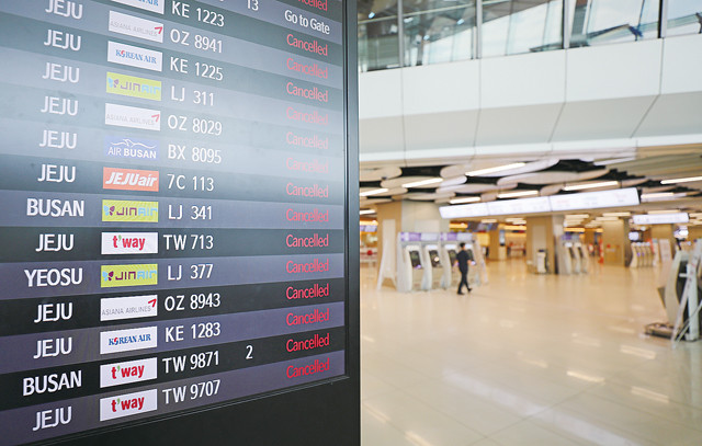 제8호 태풍 ‘바비’가 한반도로 접근하고 있는 26일 오전 서울 김포공항 여객기 운항 정보 스크린에 결항 표시가 띄워져 있다.