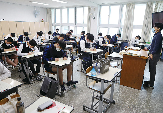 21일 오전 부산진고등학교에서 3학년 학생들이 대학수학능력시험 모의평가인 ‘전국연합학력평가’를 치르고 있다.