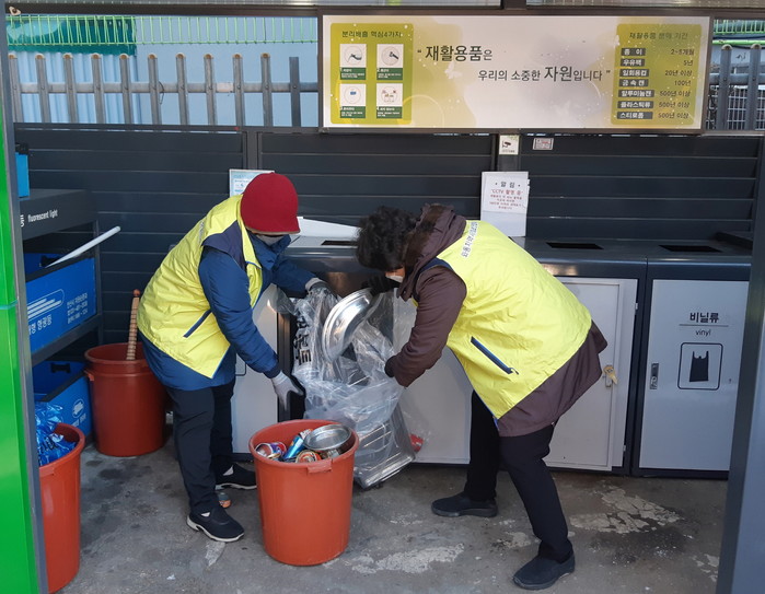 경기 안산시 단원구 와동 지역사회보장협의체는 최근 약 4주간에 걸쳐 강서고 뒤 와동 재활용 동네마당에서 2인1조로 팀을 이뤄 재활용품의 선별 및 분리작업 등 봉사활동을 펼쳤다. 사진은 협의체 위원들이 재활용쓰레기를 선별하고 있는 모습. (사진제공=안산시청)