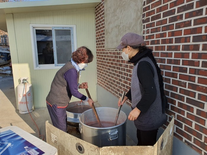 인천 강화군 내가면 주민자치위원회는 최근 ‘사랑의 동지 팥죽 나눔’ 행사를 열고 팥죽 140그릇을 만들어 비대면 방식으로 지역내 노인들에게 전달했다. 사진은 이날 위원들이 팥죽을 만들고 있는 모습. (사진제공=강화군청)