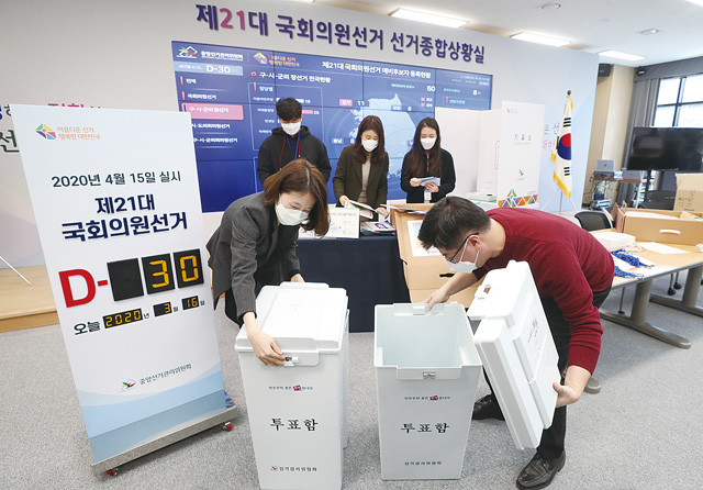 내달 15일 치러지는 제21대 국회의원 선거를 30일 앞둔 16일 과천 중앙선거관리위원회에서 직원들이 투표 관련 물품을 점검하고 있다.