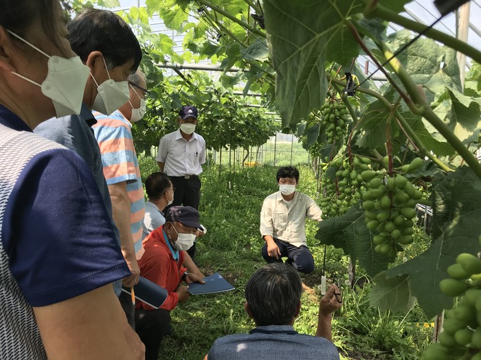 전남 진도군이 고품질 포도인 ‘샤인머스켓’ 재배농가와 관심농가를 대상으로 최근 포도 생산을 위한 재배기술 현장 교육을 실시했다. 이번 교육에서 고품질 재배 기술을 기본으로 진도군 기후와 토양에 맞는 시기별 영농 기술 재배 매뉴얼을 제작, 교육 자료로 활용해 호평을 받았다. 사진은 진도군 농업기술센터 관계자가 농민들에게 샤인머스켓 재배기술에 대해 설명하고 있는 모습. (사진제공=진도군청)