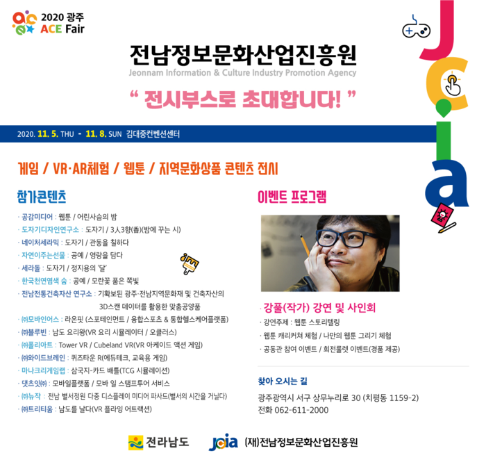 (재)전남정보문화산업진흥원(원장 이준근. 이하 ‘진흥원')은 2020 광주 ACE Fair에 지역 문화산업 기업들과 함께 공동관을 운영, 도자기, 공예품, 웹툰 등 문화컨텐츠 제품들과 VR을 활용한 게임, 시뮬레이션, 어트랙션 등 관련 기술을 선보이고, 상담 등을 통해 판로확대 및 기업 네트워크 활성화의 장을 마련할 예정이라고 밝혔다.