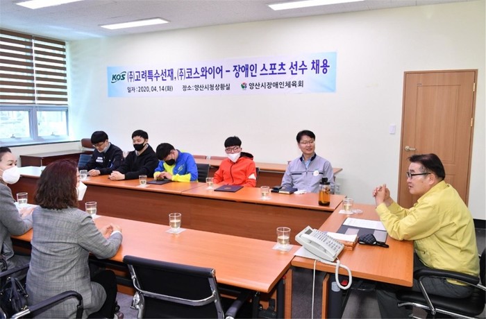 양산시장애인체육회는 양산일반산업단지 소재 기업체인 ㈜고려특수선재, ㈜코스와이어에서 장애인 스포츠선수 4명을 고용계약 체결했다고 밝혔다.