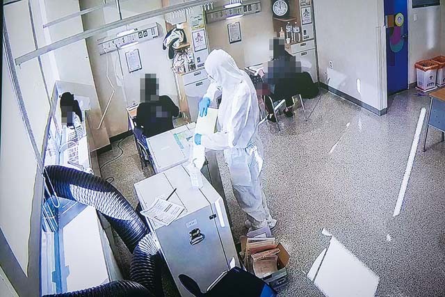 2021학년도 대학수학능력시험 당일인 3일 오전 서울 중랑구 서울의료원 격리병동에 마련된 코로나19 확진 수험생 전용 임시 고사장에서 시험을 치르는 수험생들이 폐쇄회로 화면에 보인다. 이날 서울의료원에서 시험을 치른 수험생은 5명이다.