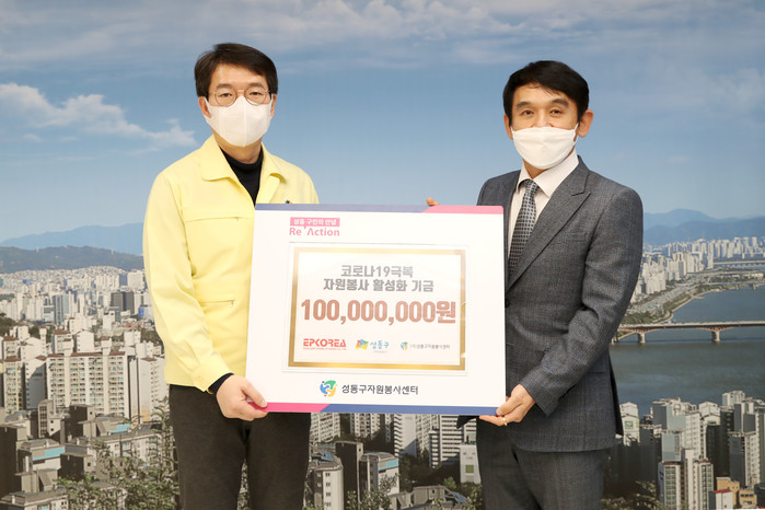 서울 성동구자원봉사센터는 지난 22일 지역내 기업인 이피코리아(주)로부터 코로나19 장기화로 복지사각지대에서 어려움을 겪는 이웃을 위한 ‘코로나19 극복 자원봉사 활성화 기금’ 1억원을 기부받았다. 사진은 전달식에서 정원오 구청장(왼쪽)과 배문찬 대표가 기념촬영을 하는 모습. (사진제공=성동구청)