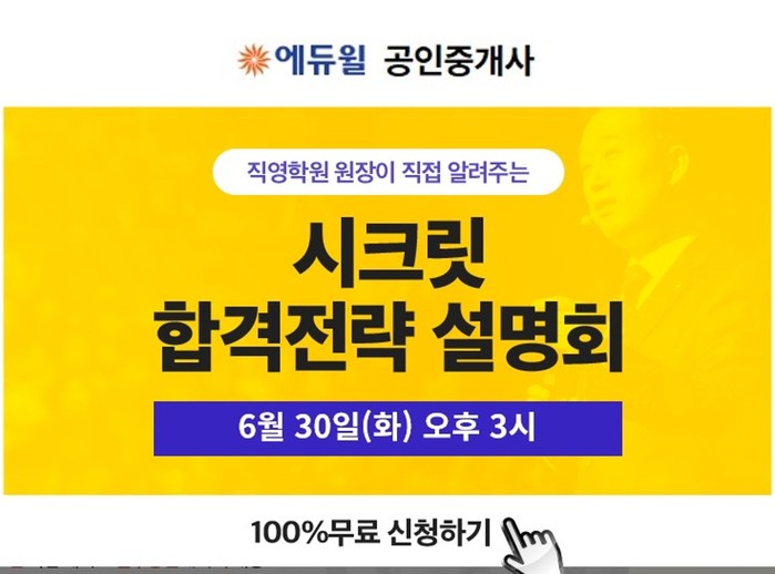 [시민일보 = 여영준 기자] 종합교육기업 에듀윌의 전국 20개 공인중개사 학원이 오는 30일 오후 3시 학원 원장이 직접 알려주는 ‘시크릿 합격전략 설명회’를 개최한다.
