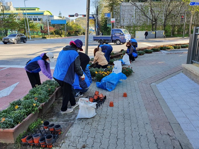경기 의정부시 송산2동 주민센터는 최근 용민로 및 용현로 일대에 가자니아·디모르포세카 등 봄꽃 4000본을 식재하는 봄맞이 아름다운 꽃길 가꾸기 행사를 개최했다. 사진은 이날 참여한 봉사자들이 꽃을 심고 있는 모습. (사진제공=의정부시청)