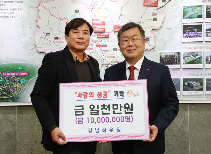 박일호 밀양시장은 “항상 지역의 이웃을 위해 나눔을 실천해주시는 강남하우징에 감사드린다”며 “성금은 소외된 이웃에게 소중히 쓰일 수 있도록 하겠다”고 말했다.