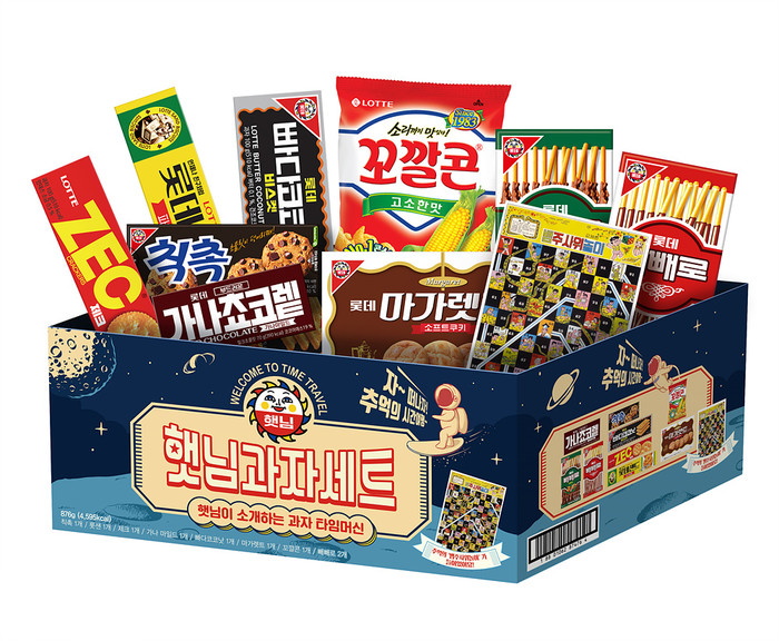 ‘햇님과자세트’에는 빼빼로 2종(초코, 아몬드)과 마가렛트, 가나초콜릿, 빠다코코낫, 꼬깔콘, 롯데샌드, 제크, 칙촉 등 총 9종의 제품이 들어 있으며 과거의 패키지 디자인을 적용하했다. 제품명도 ‘가나쵸코렡’ 등 과거 표기했던 그대로 적용했다.