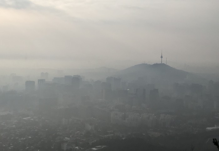 초미세먼지가 나쁨 수준을 보인 1일 오전 서울 종로구 인왕산 정상에서 내려다본 서울 도심이 뿌옇다.