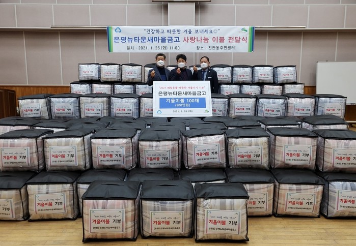 서울 은평구 진관동 주민센터는 은평뉴타운새마을금고로부터 최근 500만원 상당의 겨울이불 100채를 기부받았다. 후원물품은 겨울철 방한에 취약한 주거취약 가구를 우선적으로 선정해 지원됐다. 사진은 전달식에서 관계자들이 기념촬영을 하는 모습. (사진제공=은평구청)
