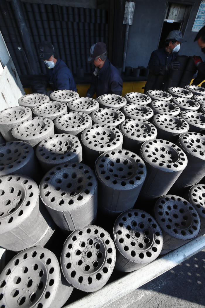 날씨가 추워지며 연탄 사용량이 늘어나는 가운데 10일 오후 경북 영주시 휴천동의 한 연탄공장에서 직원들이 배달할 연탄을 트럭에 싣고 있다.