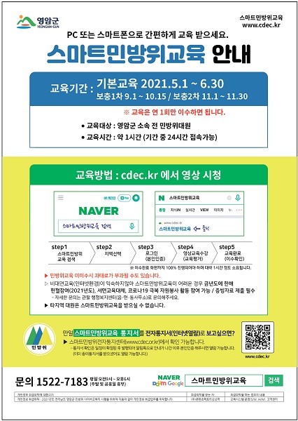 사이버교육은 1시간 동안 진행되며, 영암군 소속 민방위대원이면 누구나 PC와 스마트폰(아이폰 포함)을 이용해 스마트 민방위교육사이트에서 본인인증을 거쳐 교육을 받을 수 있다.