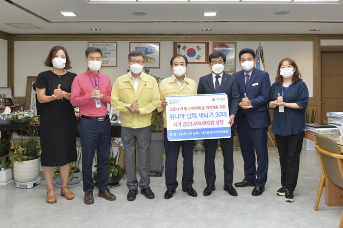 경기 포천시는 (주)위니아딤채·대유몽베르CC로부터 3일 지역내 취약계층 지원을 위한 대유위니아 세탁기 50대(2360만원 상당)를 전달받았다. 사진은 전달식에서 박윤국 시장(가운데)이 관계자들과 기념촬영을 하고 있는 모습. (사진제공=포천시청)