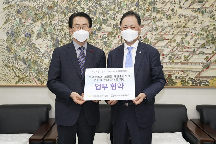 서울 종로구는 지난 22일 구청장실에서 아웃도어 제품을 생산하는 (주)비와이엔블랙야크와 ‘투명 페트병 고품질 재활용 사업 협약’을 체결했다. 이날 협약식은 투명 페트병을 수거·재활용해 자원순환도시를 구현하고자 마련됐다. 사진은 협약식에서 김영종 구청장(왼쪽)과 강태선 대표이사가 기념촬영을 하는 모습. (사진제공=종로구청)
