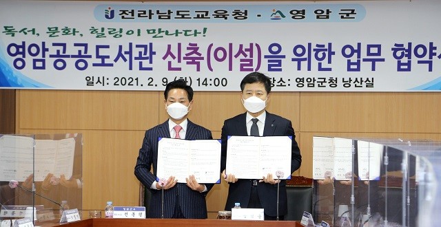 [영암=정찬남 기자] 전남 영암군은 9일(화) 군청 낭산실에서 전동평 영암군수와 장석웅 전라남도교육감 및 관계자들이 참석한 가운데 영암공공도서관 신축을 위한 업무협약을 체결했다.