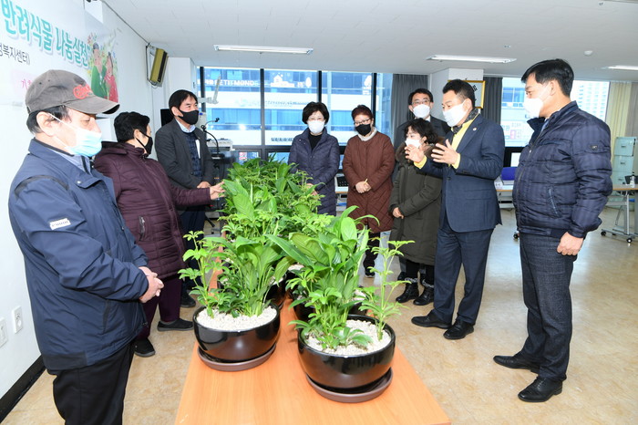 경기 구리시는 지난 2일 구리지속가능발전협의회 기후변화분과 주관으로 공기정화 반려식물을 기르며 건강한 신체 활동과 정서적 안정 도모를 위해 ‘어르신들을 위한 공기정화 반려식물 나눔 전달식’을 열었다. 사진은 안승남 시장(오른쪽)이 반려식물 나눔 행사에서 노인들 및 관계자들과 이야기를 나누고 있는 모습. (사진제공=구리시청)