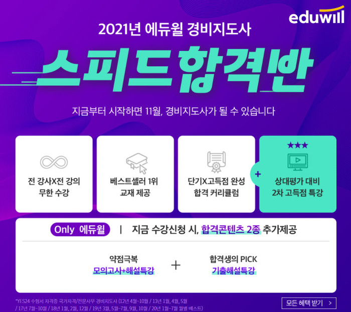 [시민일보 = 여영준 기자] 종합교육기업 에듀윌(대표 박명규) 경비지도사는 빠른 합격을 지원하기 위해 ‘스피드합격반’을 운영 중이라고 밝혔다.