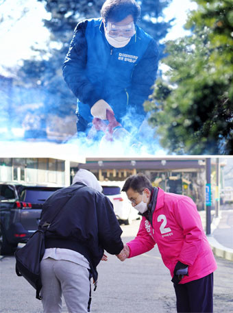 서울 종로구 출마 후보자인 이낙연 더불어민주당 코로나19 국난극복위원회 위원장이 11일 종로구 구기동에서 한 양로원 외곽 소독을 하고 있다(위). 21대 총선에서 서울 종로에 출마하는 미래통합당 황교안 대표가 11일 오전 종로구 평창동에서 출근길 시민들에게 인사하고 있다.