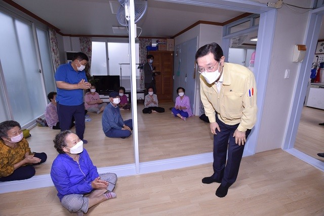 | ▲ 이용섭 광주광역시장이 6일 오후 서구 금호시영일반아파트 경로당을 방문해 코로나19 감염 예방과 폭염대비 냉방기 가동상황을 점검한 뒤 어르신들을 격려하고 있다./광주광역시 제공 |