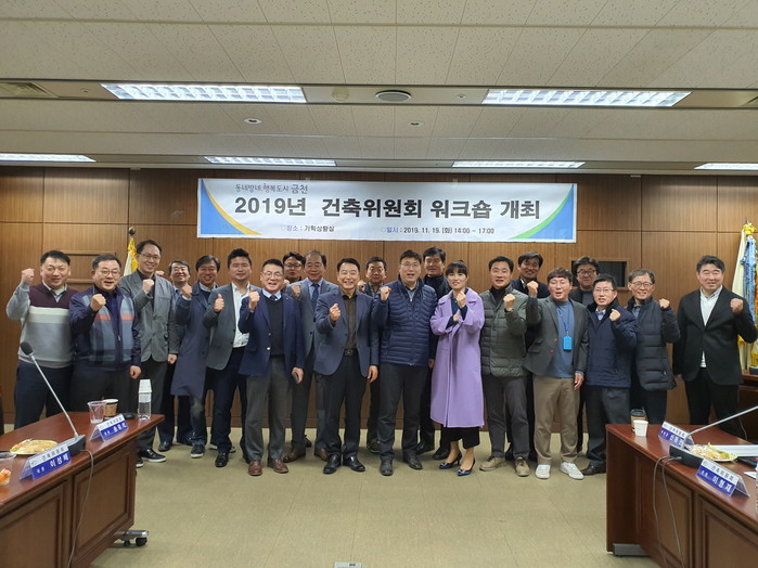 서울 금천구가 지난 19일 구청 기획상황실에서 건축환경 발전을 위한 ‘건축위원회 워크숍’을 개최했다. 이날 워크숍에는 건축위원회 위원과 구청 관계자 총 22명이 참석해 올 한해 건축위원회 심의현황을 공유하고, 심의과정에서 발생한 주요 사항에 대해 논의하는 시간을 보냈다. 사진은 참여자들이 기념촬영을 하는 모습.(사진제공=금천구청)