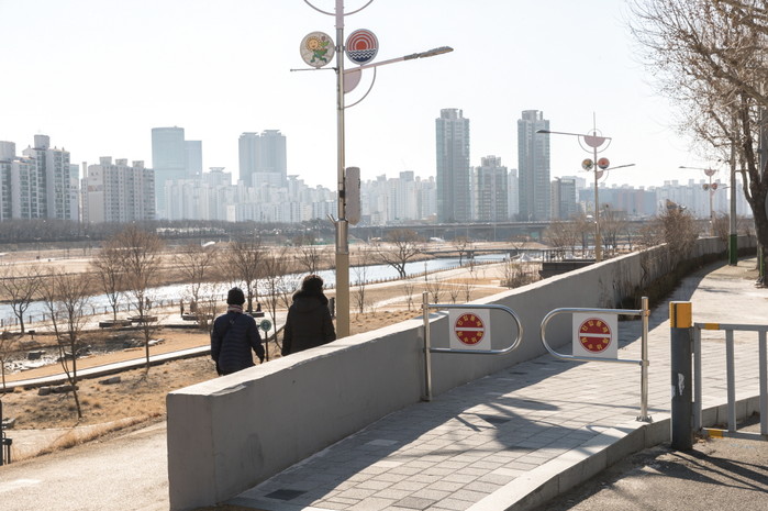 이 사업은 집중호우나 태풍 등 위기상황 시 사전대처하고 이용자의 안전사고를 예방하기 위해 실시된다. 사진은 안양천 신정교 출입통제시설 옆으로 주민들이 산책하고 있는 모습. (사진제공=양천구청)