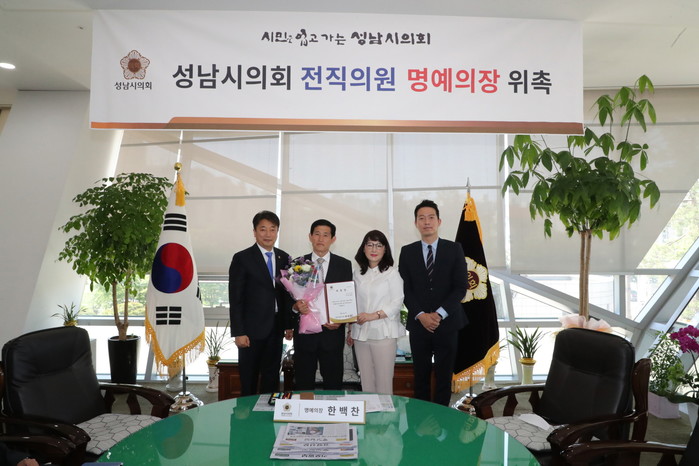 박문석 의장은 “지금의 성남시의회로 거듭날 수 있었던 것은 원로의원님들의 성실하고 열정적인 의정활동이 있었기에 가능했다.”며, “명예의장 제도를 통해 전‧현직 의원 간 화합의 장이자 시의회 역사를 계승하는 발판이 되기를 바란다.”라고 한백찬 초대의원의 명예의장 위촉을 축하했다.