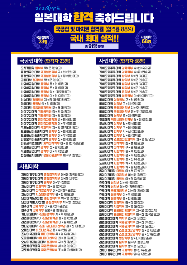 이번 합격생 총 91명은 오사카대학, 동경외국어대학, 고베대학 등 국공립대학에 23명이 합격했으며, 게이오대학, 와세다대학, 메이지대학 등 사립대학에 68명이 합격하는 등 국공립 및 사립 명문대학 합격률이 88%로 타 학원 또는 전문기관보다 높은 성과를 기록했다.