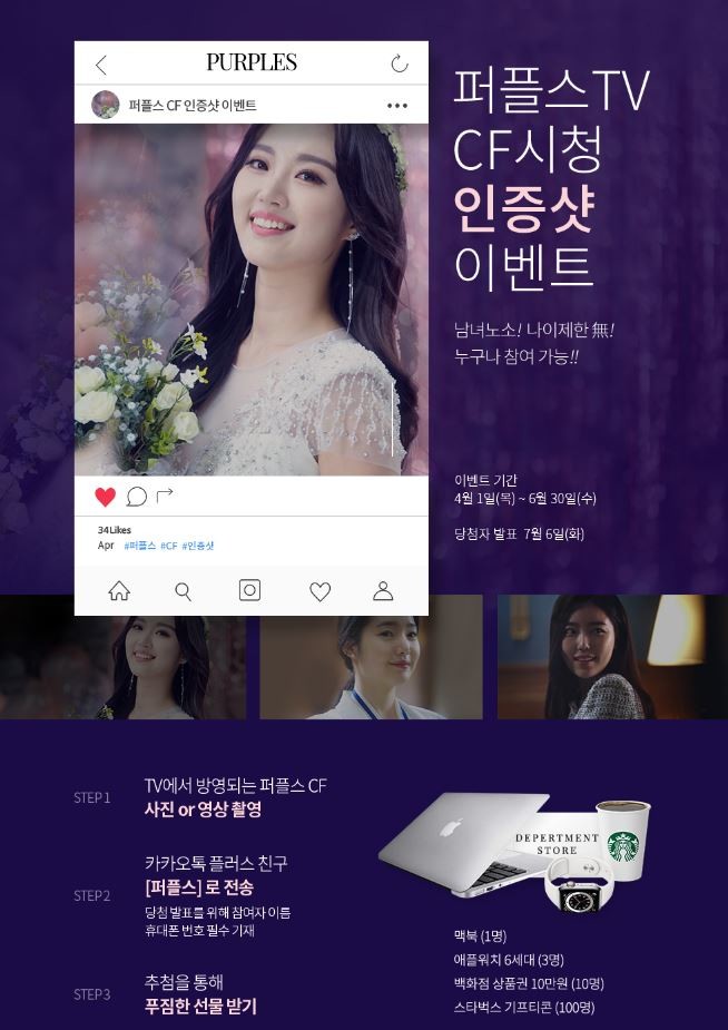 퍼플스 이벤트 기획자는 “현재 많은 분들이 퍼플스 CF를 보시고 인증샷 이벤트를 신청해주고 있다. 본 이벤트는 성별, 나이제한이 없고 누구나 쉽게 신청할 수 있기 때문에 많은 관심과 참여 바라며, 이벤트 상품 수량도 여유 있어 당첨될 확률이 매우 높을 것”이라고 전했다.