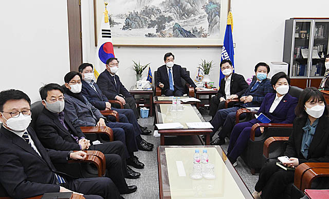 더불어민주당 이낙연 대표와 지도부가 18일 오전 서울 여의도 국회 당대표실에서 문재인 대통령 신년 기자회견을 시청하고 있다.