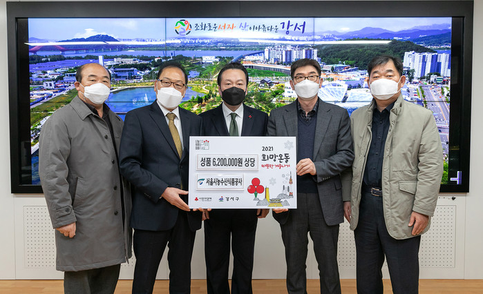 서울 강서구는 최근 서울시농수산식품공사 강서지사로부터 과일·쌀 등 620만원 상당의 이웃돕기 성품을 전달받았다. 기탁물품은 지역내 장애인시설, 미혼모시설 등 지역내 어려운 이웃에게 전달된다. 사진은 전달식에서 노현송 구청장(가운데)과 관계자들이 기념촬영을 하는 모습. (사진제공=강서구청)