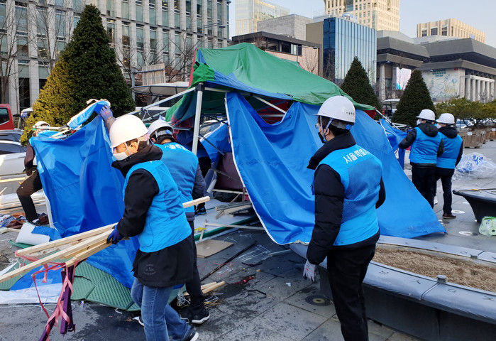12일 오전 서울시청 관계자들이 서울 광화문 광장에서 시민단체 '전두환 심판 국민행동'이 설치한 천막 한 개 동을 철거하는 행정대집행을 하고 있다.