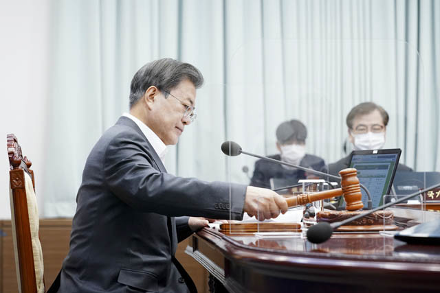 문재인 대통령이 15일 오전 청와대에서 영상 국무회의를 시작하며 의사봉을 두드리고 있다.