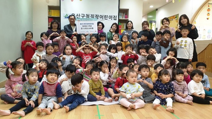 서울 용산구청직장어린이집이 최근 용산복지재단에 지역내 어려운 이웃을 위해 써달라며 바자회 수익금 143만3500원을 기탁했다. 이날 전달된 성금은 지역내 소외계층을 위해 사용될 예정이다. 사진은 어린이집 아이들과 관계자들의 기념촬영 모습. (사진제공=용산구청)